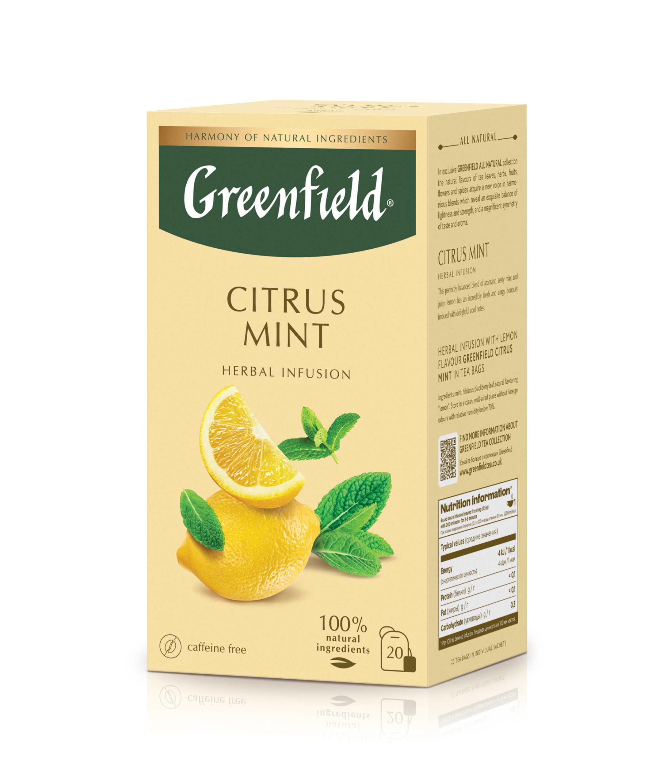 Greenfield Citrus Mint — это освежающая травяная смесь без кофеина, сочетающая в себе терпкую свежесть цитрусовых и охлаждающую свежесть мяты. Этот успокаивающий настой обладает естественным бодрящим вкусом и ароматом, идеально подходящим для восстановления сил в любое время дня. Подается как горячим, так и охлажденным, это восхитительно сбалансированный напиток, способствующий расслаблению и хорошему самочувствию.
